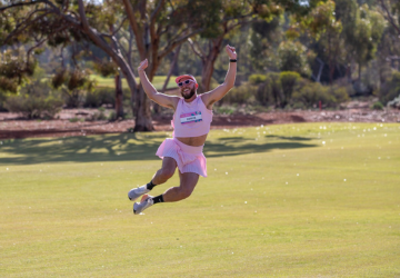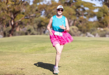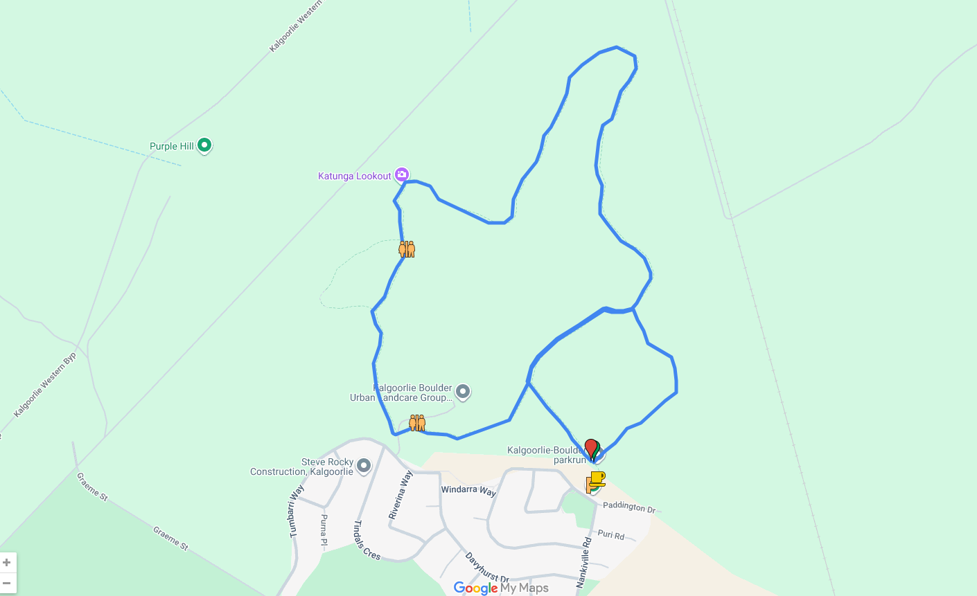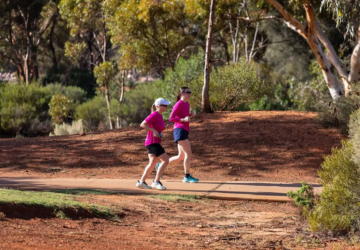 The course loops through Karkula Bushland Park, an expansive nature reserve on the edge of town. Participants follow bushland trails through native trees, with an uphill section leading to an elevated viewing platform offering wide views across the surrounding plains.