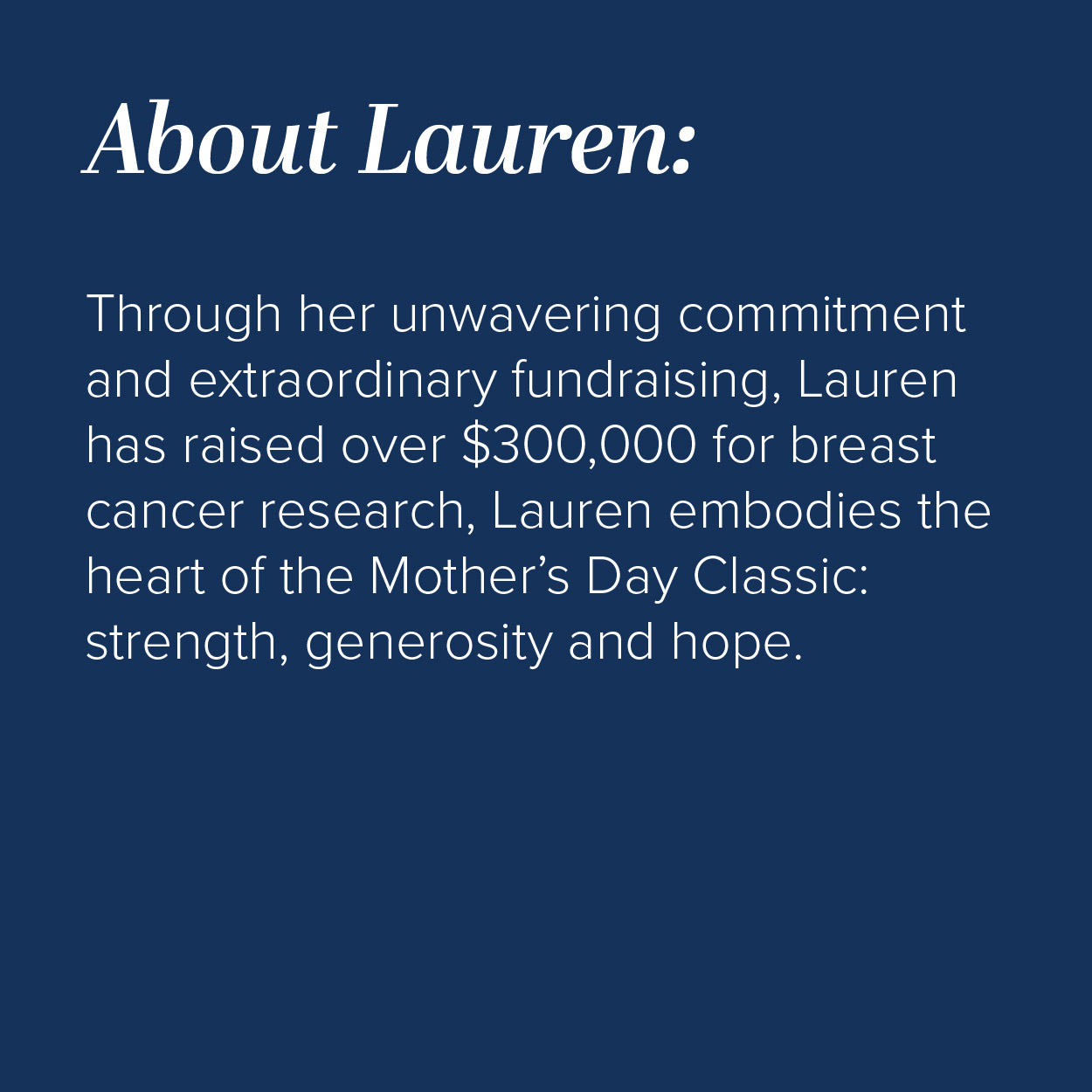 The Lauren Navy Cap honours Lauren Couter, one of our Classic Icons and a passionate supporter of the Mother’s Day Classic for more than 15 years.