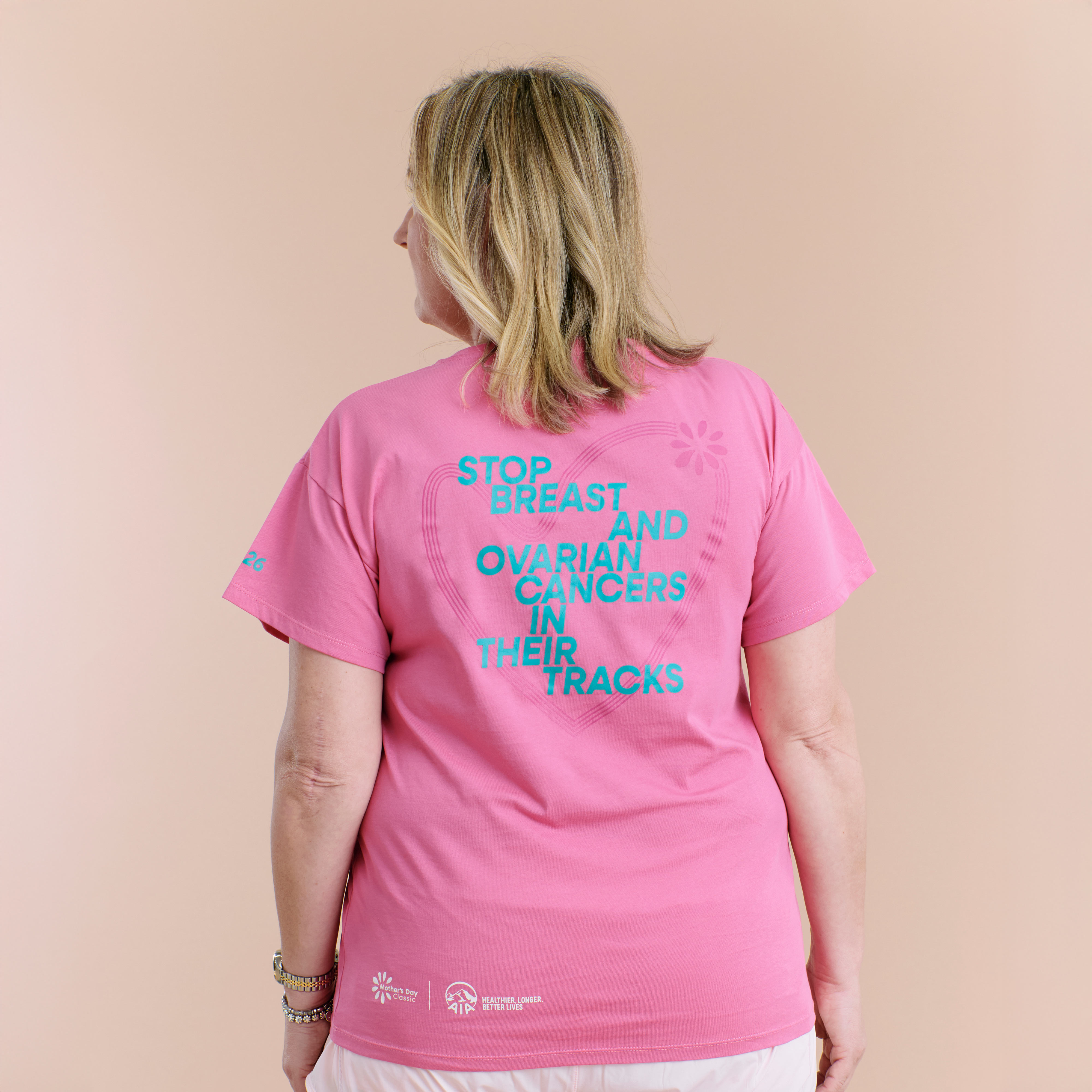 The Leigh Pink Tee is a unisex fit tee made from super soft combed cotton, featuring a small teal collegiate curved style graphic on front chest and “Stop Breast and Ovarian Cancers in their tracks” emblem on the back.